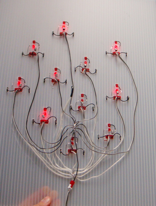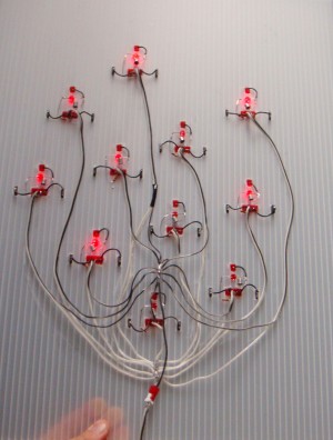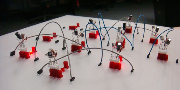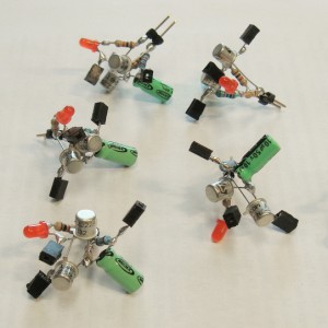 The first round of Multivibrator circuit units. Their legs just support the power supply. Interaction connections and sensor readings are made with direct wire connections to female pins in the sculpture.