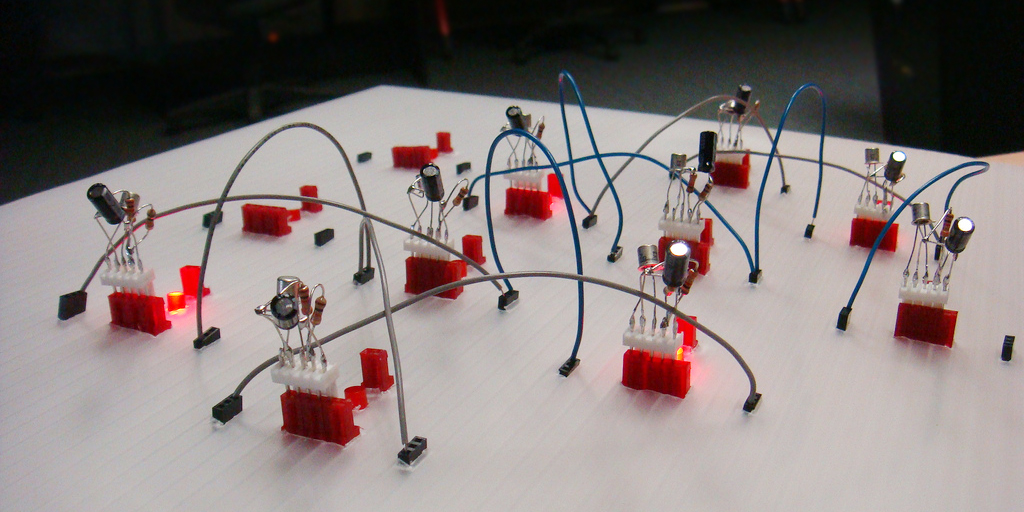 Small electronic circuits made from analog components (resistors, capacitors, transistors, inductors, diodes) serve as building blocks for a larger network of interconnected units. The circuit schematics for the individual units are kept simple in their number of components and are deliberately not designed to forcefully recreate behaviors already found in nature (circuits mimicking neuron behavior). The network consists of many units with similar simple circuit designs that produce predictable behavior in form of oscillation. Each unit has input and output connections linked to one or more other units in the network. By linking these simple circuits up into a large network, all the electronic circuits are interconnected, influence each other and cause an overall more complex behavior. The implementation of the hardware setup in form of a modular kit allows for a more free and exploratory plug-and-play research.