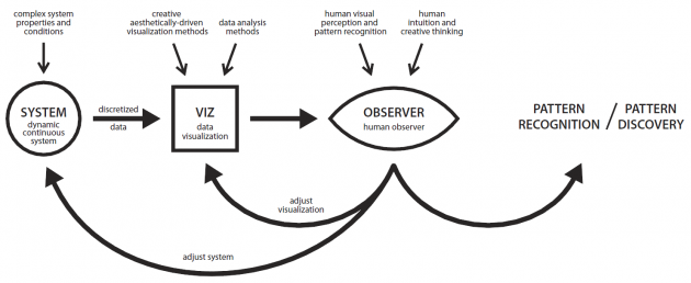 The data visualization doesn't judge the signal character and leaves the evaluation of the system behavior to the human observer. The observer becomes part of the system as his visual perception receives the task of pattern recognition and pattern discovery and his cognition the task to determine the system's level of complexity. The observer has the option to adjust the visualization or to adjust the created system, if after repeated study no signs of complex patterns are found. In the process of research the system, the visualization and the observer will undergo a series of changes until the possible discovery of true emergent behavior.