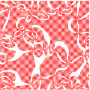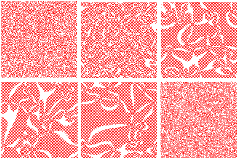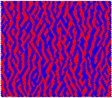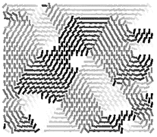 Larger lattices, approaching infinite sizes (simulated by periodic boundary conditions), contain more vortex centers. Every vortex center becomes a crossing for 4 antiferromagnetic domains where the magnets are aligned with the horizontal or the vertical axis of the lattice. Those perpendicular aligned domains get connected on the edges with micro-vortex patterns. The picture below shows the aligned domains in white and the micro-vortex domains in grey color. The edges between those neighboring domains show smooth curved boundaries.