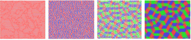 Equilibrium states of square 20×20 dipole lattices starting from random spin configuration, with identical initial parameters.