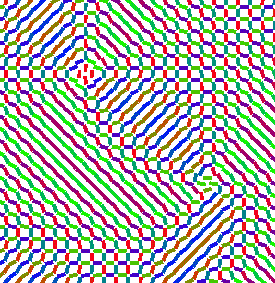 A hexagonal 50×50 lattice with random start configuration settles down into macro vortex patterns.