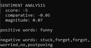 The one I ultimately implemented into the app is sentiment, a Node.js module that analyzes text based on the AFINN-165 dataset (3382 words coded with a goodness/badness value). After analysis of a text segment, the module hands back a score, a comparative value, and a list of those words it deemed as either good or bad.