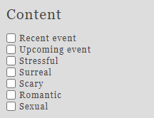 So I settled on a list of categories (or rather: not mutually exclusive content flags) that made the most sense to me. They have to be selected manually.