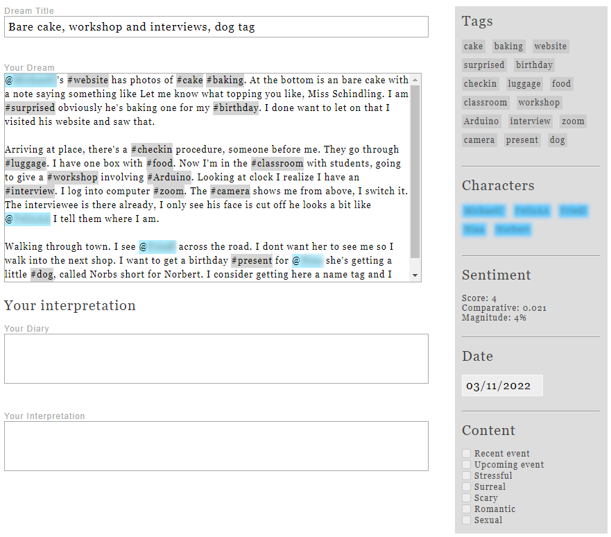 I experimented a bit with A.I. text analysis, hoping to find an automated way to define a dream's themes (content classification) and extract keywords, but I found the results too messy. Most likely due to the fact that a lot of my dream texts are rather short, and in typical dream-fashion rather chaotic in nature. In addition, writing them down while still half asleep, doesn't produce the best written English.