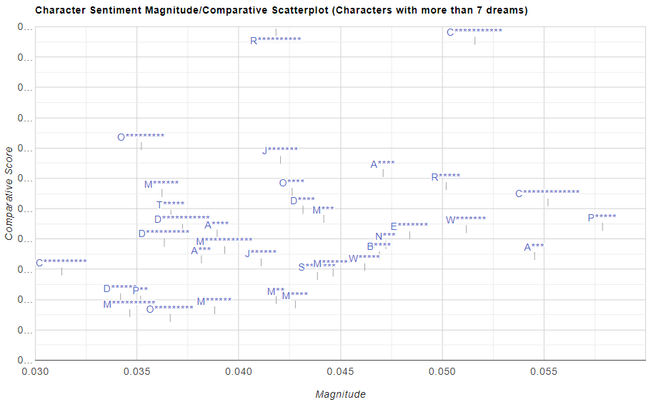 An intriguing visualization is a plot showing each of your dream character's average sentiment scores. Who do you have the most positive or most emotionally charged dreams about?