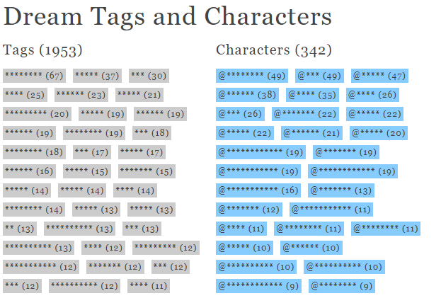 After entering a lot of dreams (I am at nearly 700 now) the simplest yet most informative feature of the database is a list of tags and characters sorted by occurrences. Naturally, what you dream of the most, is quite a tell.