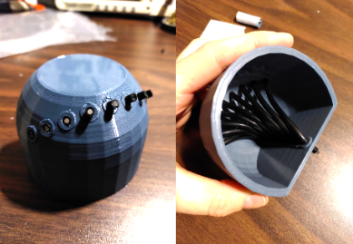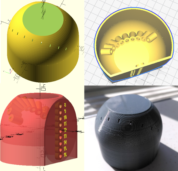 On the left you see the OpenSCAD renders of the final design. The top of the object is flat, to be able to 3d-print it upside down. The light shafts are extruded into the interior of the shape, with their first immediate segment functioning as pressure-fit holders of the fiber wires.