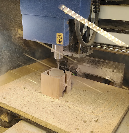 I took my 3d-design and learned how to create the cut-paths in VCarve (while also exploring Fusion 360). There was a bit of a learning curve - or rather patience curve - because while 3d-printing is pretty easy, CNC-milling from different sides and with different tools offers new challenges. The two cuts (one from each side) also took quite a long time, because I chose to cut a cherry-wood, which is rather on the hard side.