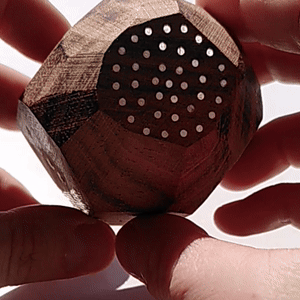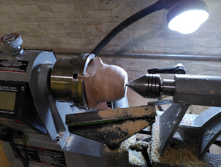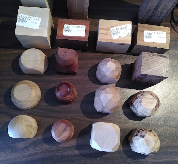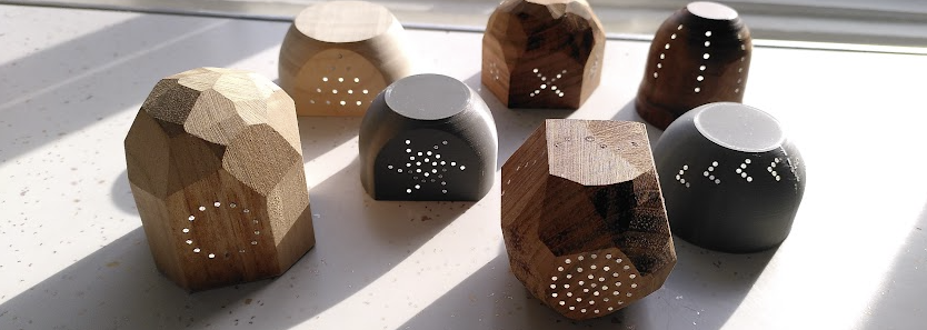I was pretty proud of my CNC-cut piece, but the time it took to get it cut was considerably too much. So it felt like time to visit Les Affûtés, a Montreal haven for woodworking workshops, and I did an introductory class to woodworking. After that I returned multiple times to use their woodshop and their lathes, drill-presses and sanding-machines to explore different shapes.