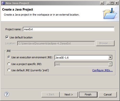 - Create a new project by: NEW > JAVA PROJECT, name the project, select the appropriate JRE (most likely JavaSE-1.7, but if you want to use your externals on older computers choose JavaSE-1.6) and click finish.