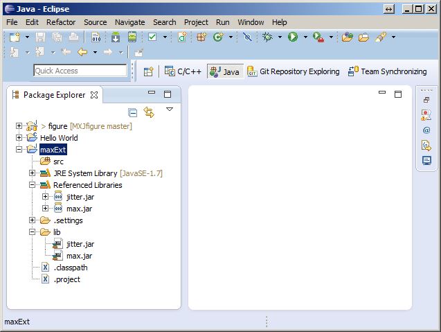 Once you added the jitter.jar and max.jar to your project's lib directory, and added both libraries to your build path, your package explorer should look like this.