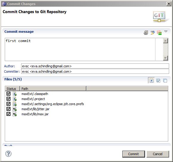 - Right click on project and: TEAM > SHARE PROJECT, select Git, click 'Create', Parent directory will be C:\Users\eva\Documents\git, name it, and click 'finish'.