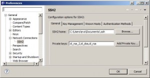 - Verify your SSH settings in Eclipse by: WINDOW > PREFERENCES > GENERAL > NETWORK CONNECTIONS > SSH2. Verify your SSH2 home is C:\Users\eva\Documents\.ssh. For this to work i had to create an additional SSH key that is only for Eclipse (in addition to my computer's usual SSH key).
