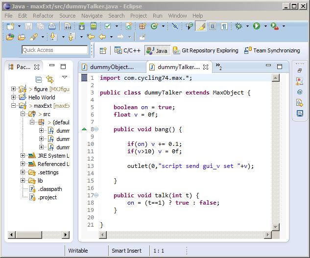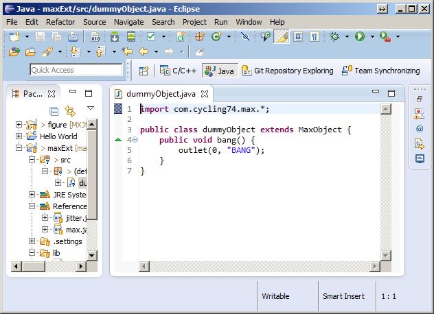 import com.cycling74.max.*; public class dummyObject extends MaxObject { public void bang() { outlet(0, "BANG"); } } - As soon as you save the file, Eclipse will autocompile it for you. Check your project directory, you should find a dummyObject.class inside the /bin directory. (The .java files inside the /src directory are the source files, while the .class files are compiled code)