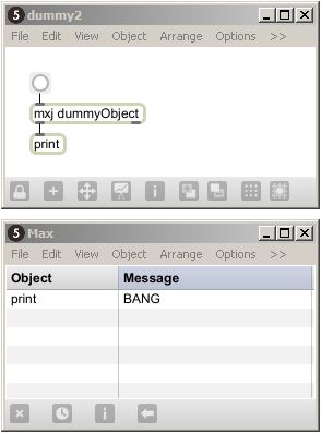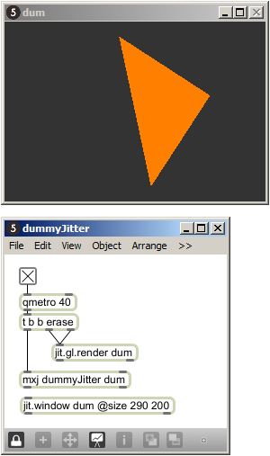 - Create a Max/MSP patch with a [jit.gl.render] object, a [jit.window] for showing the graphics, and your [mxj dummyJitter] object. Give them all the same render context, run a metro and see if you see the spinning triangle.