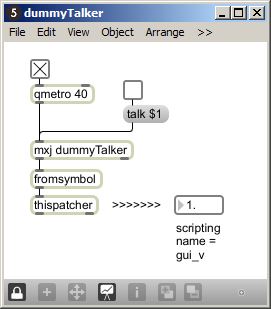 - Connect a [fromsymbol] and a [thispatcher] object to the left outlet of the java object.