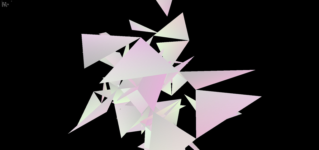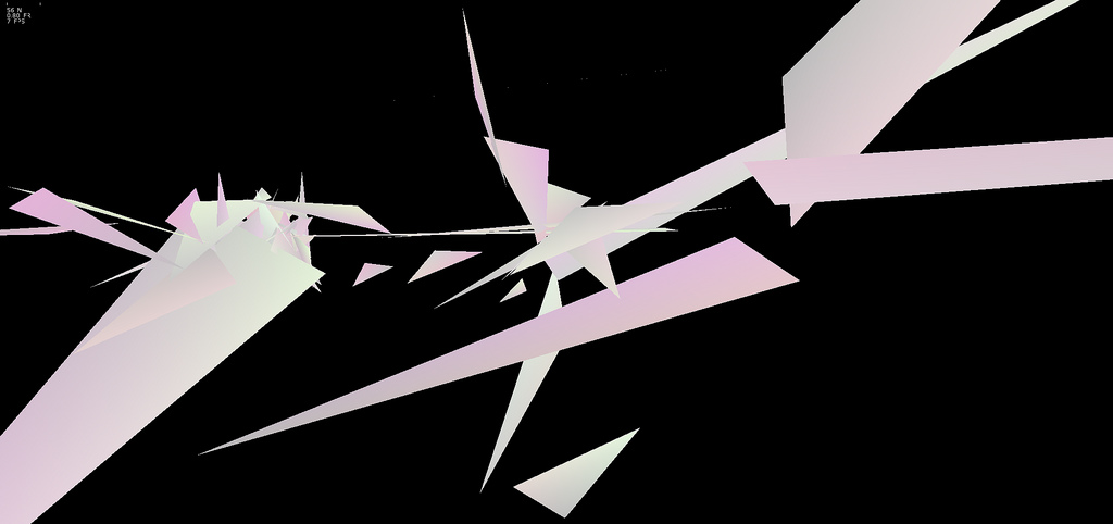 Kites Fight is an 3d pseudo-physics environment. Triangle shapes attract, repel and attach to each other following different rule-sets. Patterns form if the system is stable enough. The volume of the sound input influences the friction parameter and different action-commands.