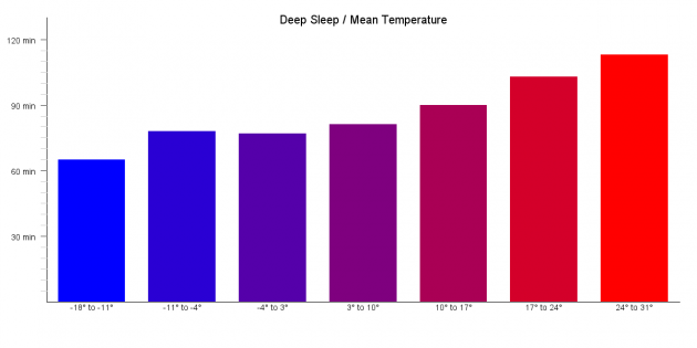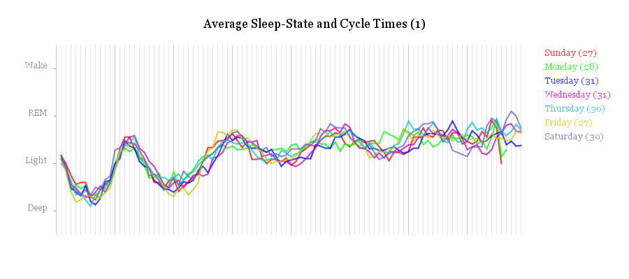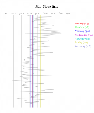 The Mid-Sleep time is halfway between falling asleep and waking up. The graph shows my mid-sleep times for a period of 255 days (i excluded obvious jetlag-days) in grey, and displays the average mid-sleep values for the individual weekdays in color. Weekends obviously haver later mid-sleep points.