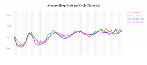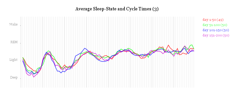 My sleep cycle time averaged over the course of the night, separated into groups based on sleep-onset time.