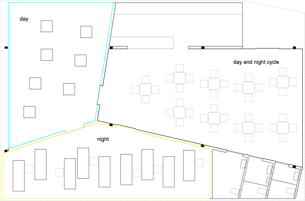 Split times café is divided into 3 cells: the natural day-night cycle, the day zone and the night zone. It gives the possibility of live in three temporalities. The zones are designed with colored glass (to force the hormones into day/night behaviors) and appropriate furniture.