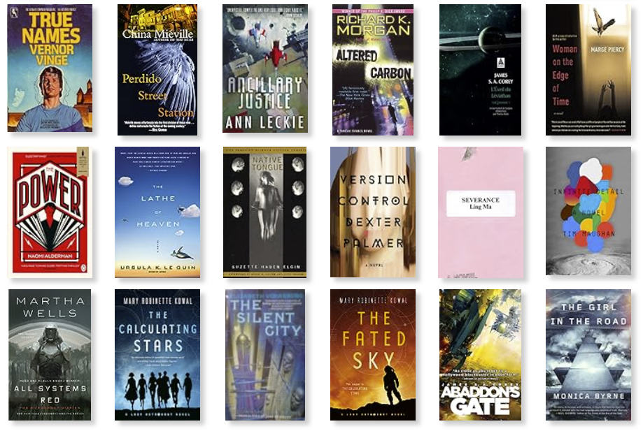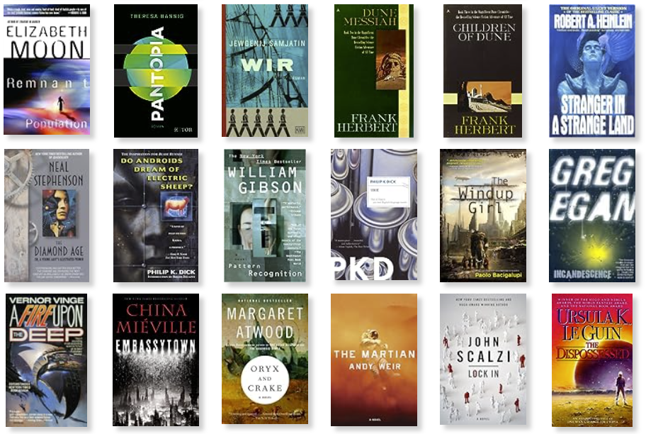 Besides the obvious brain tickle that comes from smart technological and scientific plot points, there's something about the world-building and the potential of doing-it-all-better that excites me about science fiction. Trying to make this a list of non-obvious choices (despite having read and liked lots of the more-obvious scifi-canon as well). Ordered chronologically, all of these I very much recommend: