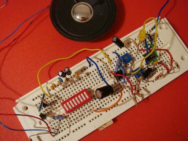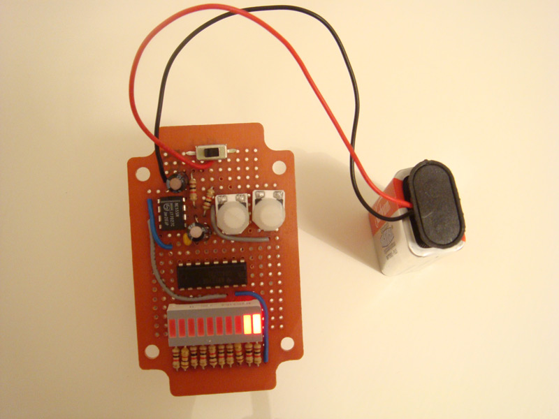 Two 555-timer circuits produce a mouse-like squeaking sound. I put in a switch-array, that allows to activate a series of capacitors that influence the charge-discharge cycle of the second timer circuit. The change in frequency of the timer changes the pitch of the squeaks. Now i can search for the most annoying squeaky sound by simple button-clicks! (Note how the video compression gives me the mostjittery hands ever!)