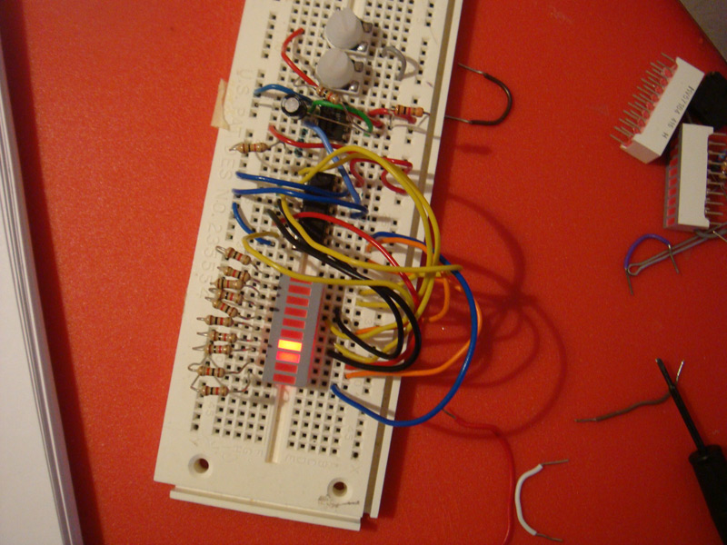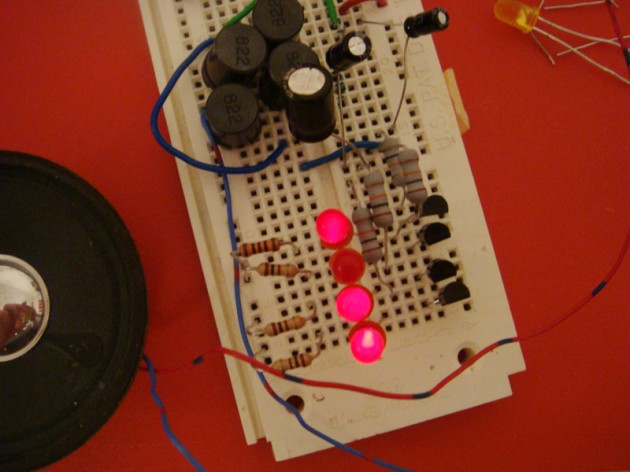 This time the audio amplification circuit was working without noise. Here i am experimenting with putting different high-pass and low-pass filters on the signal, trying to produce a light-organ that channels different frequencies to different LEDs.