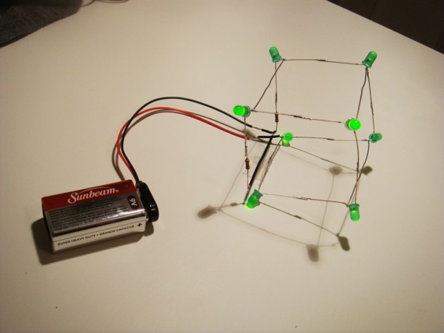 8 LEDs, 2 resistors and a 9V battery - another cube, this one with green corners.