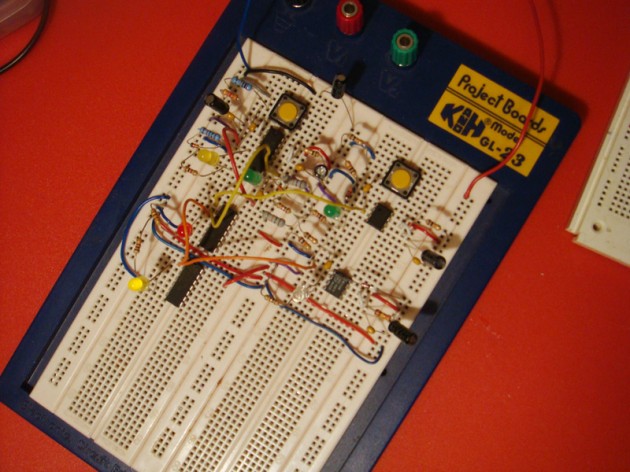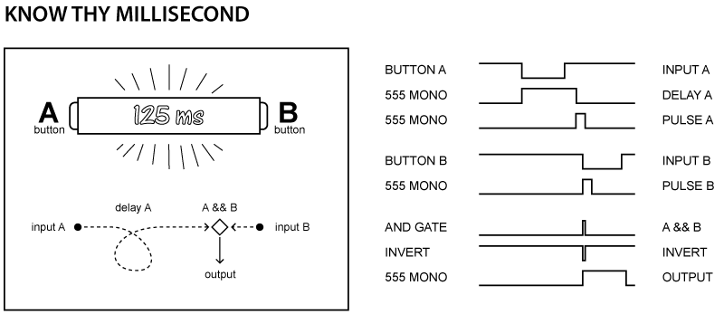 This is an idea, that demands more than 30minutes to be executed. The object "Know Thy Millisecond" will be a time-toy, a time-puzzle that lights up only if you press its two buttons at a very exact time interval. The current execution would need 4 555-timer circuits, an AND gate and an inverter. Too many components for the imagined size of the object!