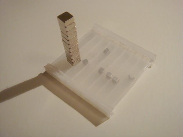 Little square magnets fit perfectly into the narrow channels of the corrugated plastic board. Once inside they react to their neighbors - attracting and repelling each other. The little board can be shaken or further meddled with using external metals or magnets. The arrangement of the magnets makes it look like a 8-channel sequencer with potential for further development. And it's an addictive toy to play with, as is everything magnetic!