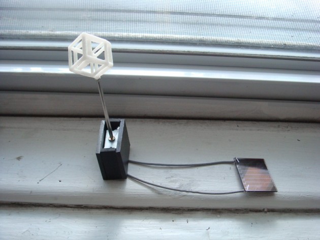 A small DC-motor, a solar cell and a 3d printed little wire-frame model of a hypercube while being rotated through 2 dimensions (one of them being dimension number 4). I've had these 3d-models from a former experiment and always wanted to put them to further use. The motor is directly powered by the solar cell, and the soldering of the solar cell was nearly impossible. Right now the whole constructions leans on my windows sill to test if any movement will happen at all, or if all the soldering caused some damage.