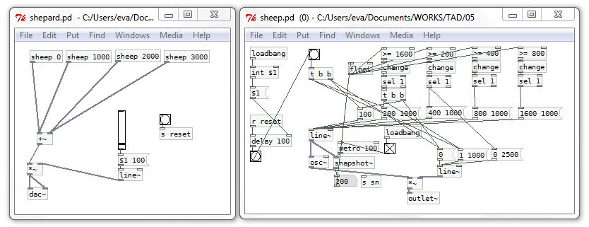 I am trying to recreate the Shepard tone phenomenon with PD. The goal is to create the illusion of a tone with a constantly rising pitch. The results are not satisfying yet, i'll have to tweak and refine it a bit more.