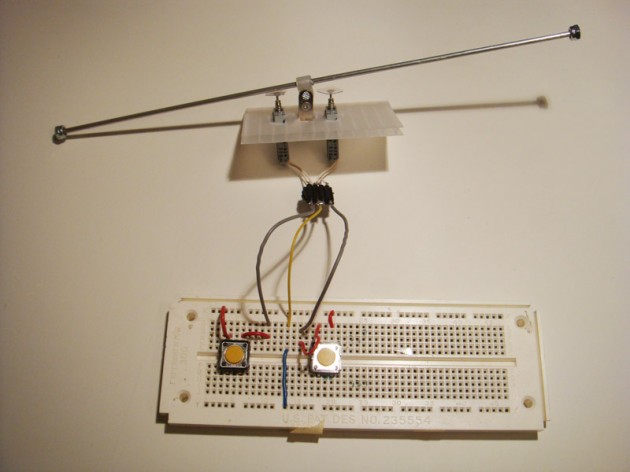 A seesaw construction from two solenoids. Corrugated plastic board, metal, plastic, electronics. Right now you have to press buttons to activate the solenoids, maybe i'll make a timer circuit activating them periodically ...