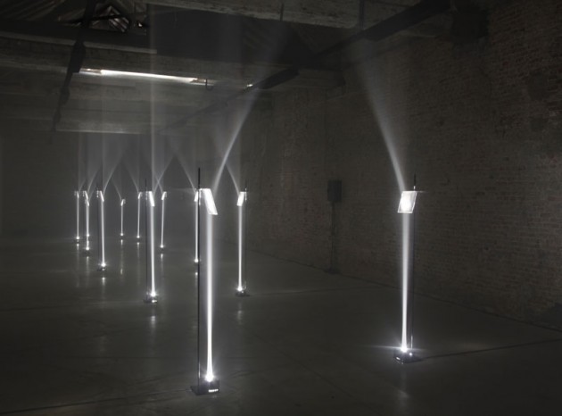 A series of eight illuminated mechanised structures, each of them shaped as a composition of intersecting angular and geometric forms that are made of thin tensed steel banding lined with rows of LEDs. The constructions continuously revolve around their own axis thereby materialising the path of the light and dissolving the spinning structures into compositions of aerial cones, spheres and ribbons of warm and cold light while giving life and shape to an immaterial construct.