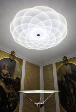 Inspired by the work of early Enlightenment scientists and the manipulation of the very substance of the light itself, the chandelier uses a large fresnel lense to shape the light generated by high power LEDs into geometrical patterns projected onto the ceiling.