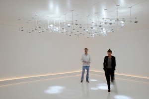 English poet John Keats commented that science had robbed nature and the rainbow of its spectacle by reducing its notion to prismatic colours. ‘Falling Light’ challenges this belief, with a captivating cinematographic interplay between crystal prisms and the preternatural experience they are able to create. 50 ceiling suspended mechanical devices each incorporating a custom cut Swarovski crystal optical lens, a computer programmed motor and a white LED. Small drops of light fall from the ceiling onto the gallery floor, the visitor is immersed in a shower of light, each droplet encircled by a vibrant halo of rainbow colours.