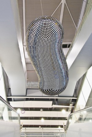 'Cloud' is a five meter long digital sculpture whose surface is covered with 4638 flip-dots that can be individually addressed by a computer to animate the entire skin of the sculpture.