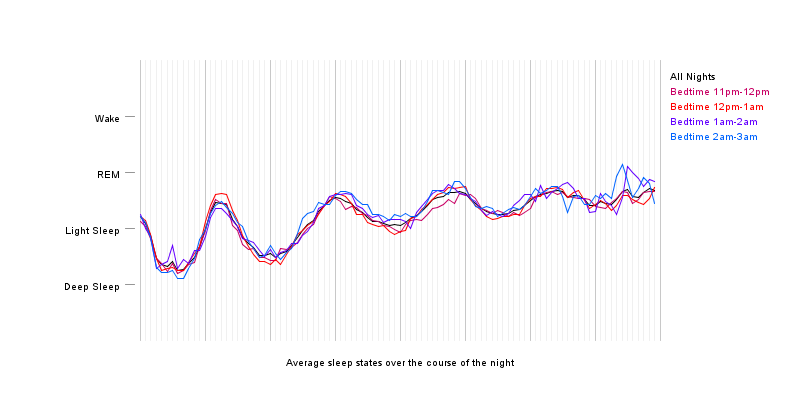 This example computes and plots the average sleep state for every 5-minute segment of all nights, and of groups of nights selected by their sleep-onset value. This plot makes it easy to read out your typical night's cycle time.