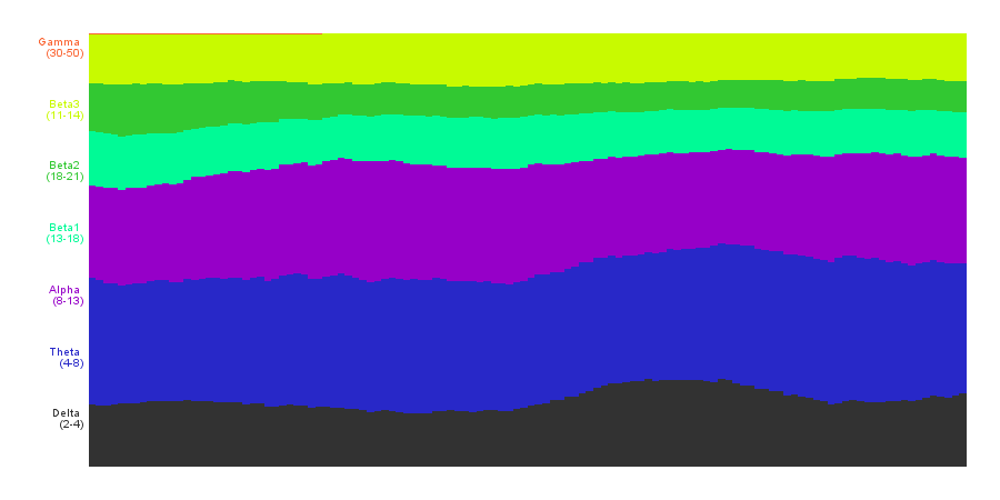 The example displays the current frequency levels and raw brainwave data on top (still need to remove 60Hz noise), and a recording of the frequency data and sleep-stages from the last half hour at the bottom. The application also can take screenshots every half hour.