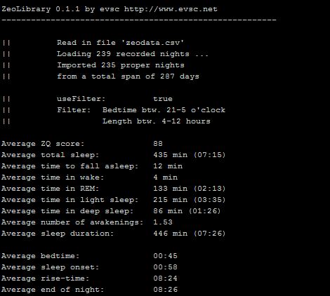 Reads in a "zeodata.csv" file and computes: number of nights, total day span, average sleep time, average time in REM / Light Sleep / Deep Sleep, average bedtime, average sleep onset, ... The results are output directly into the Processing console.