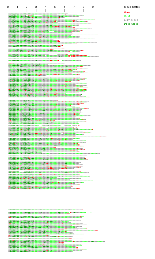 Draws the sleep_graph_5min array for all nights, with colors representing the different sleep states. The graph data starts at the onset of sleep, and nights are aligned on the left.
